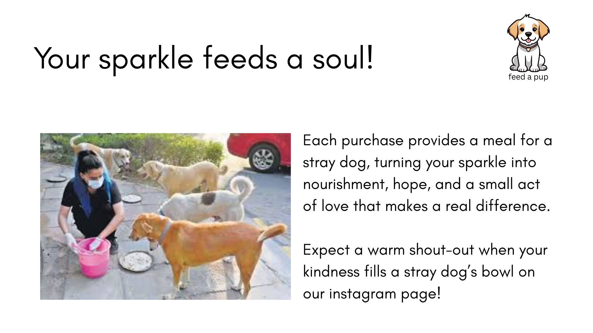With every pair, you help feed a stray dog, turning a subtle shimmer into a meaningful act of compassion. You’ll also receive a heartfelt shout-out when your sponsored pup enjoys their meal — a small reminder of the kindness you set in motion.